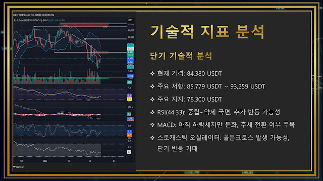 현재 비트코인은 84,380 USDT에 거래되고 있으며, 주요 저항대는 85,779 USDT에서 93,259 USDT 구간에 형성되어 있습니다. 중요 지지선은 78,300 USDT에 위치해 있습니다.