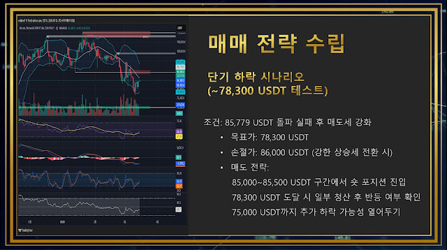 만약 85,779 USDT 저항선을 돌파하지 못하고 매도세가 강화된다면, 78,300 USDT까지 하락할 가능성이 있습니다. 이 경우 85,000~85,500 USDT 구간에서 숏 포지션 진입을 고려할 수 있으며, 손절가는 86,000 USDT에 설정하는 것이 적절합니다. 78,300 USDT 도달 시 일부 포지션을 청산하고 추가 하락 가능성을 열어두는 것이 중요합니다.
